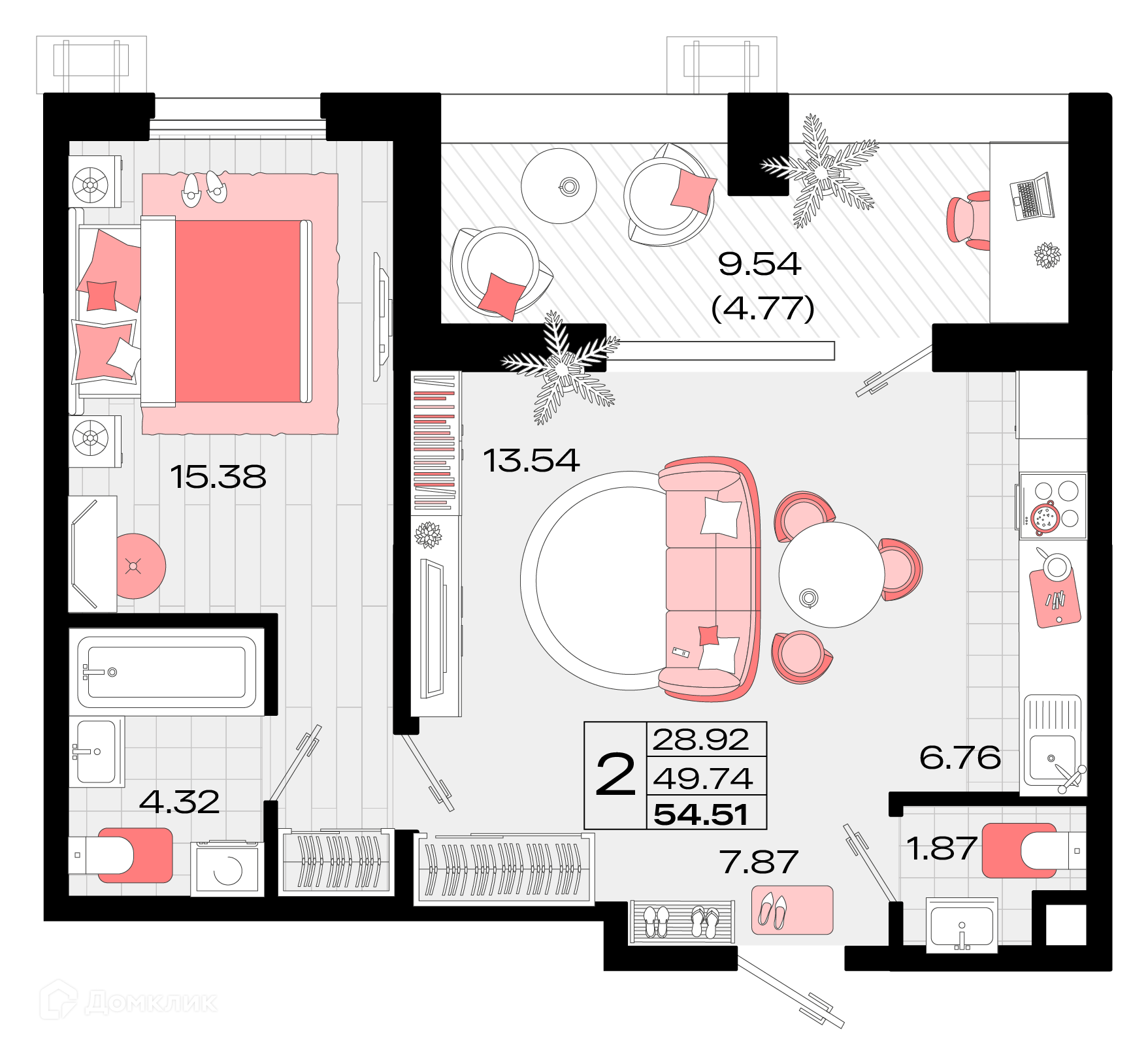 - Общая площадь: 54.51 м²