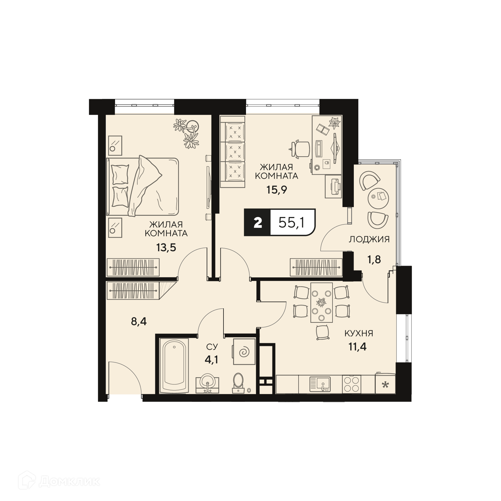 - Общая площадь: 55.1 м²