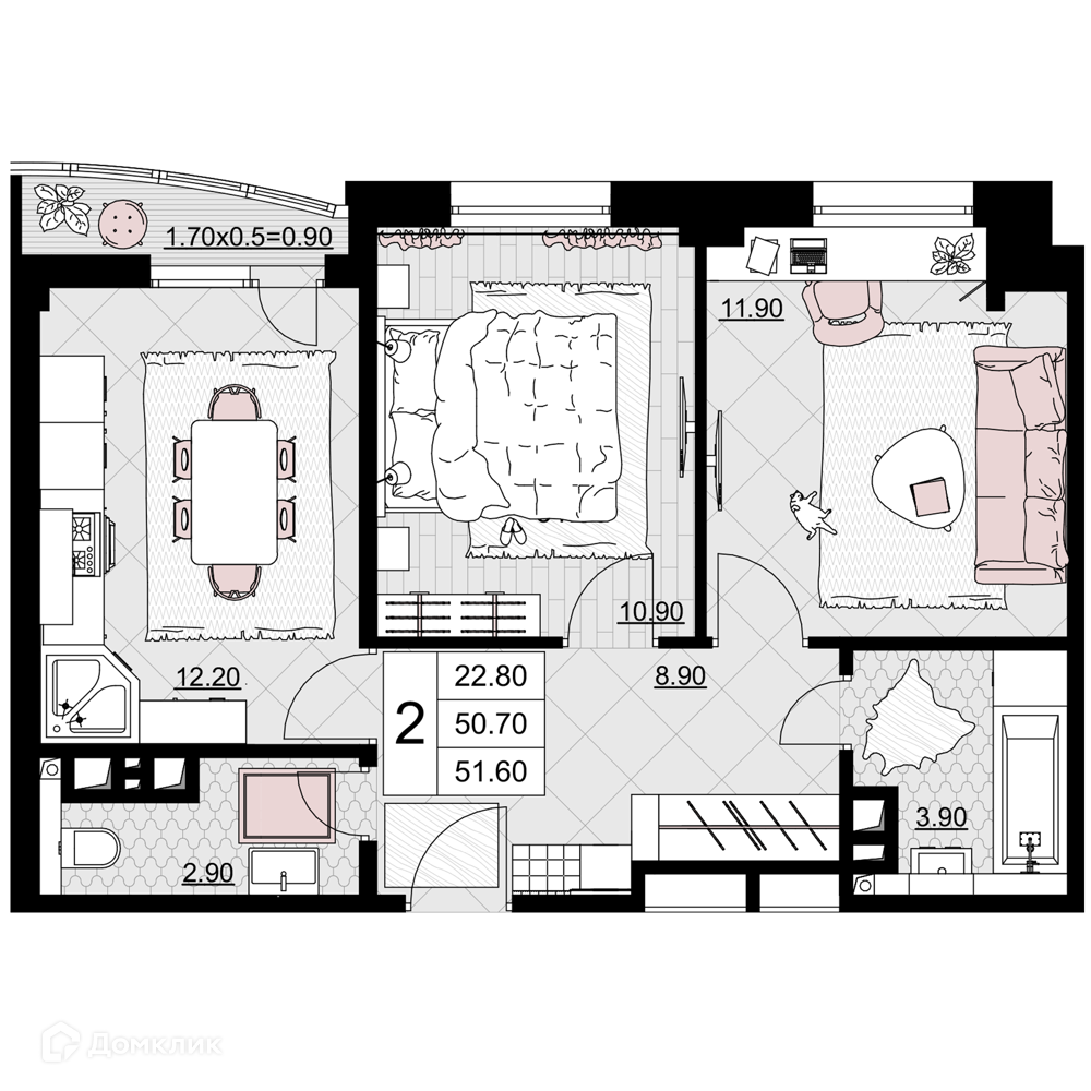 - Общая площадь: 51.6 м²