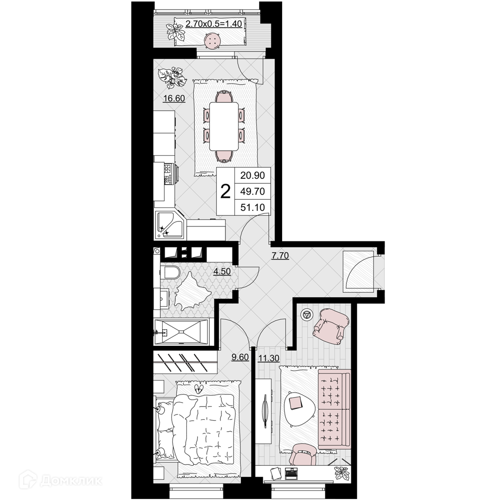 - Общая площадь: 51.1 м²