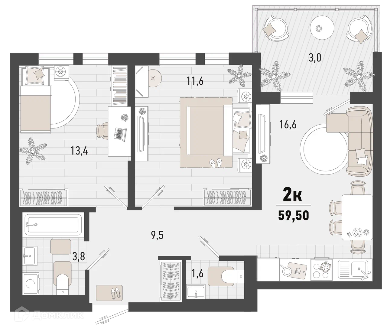 - Общая площадь: 59.5 м²