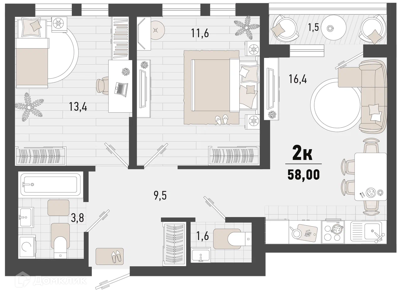 - Общая площадь: 58 м²