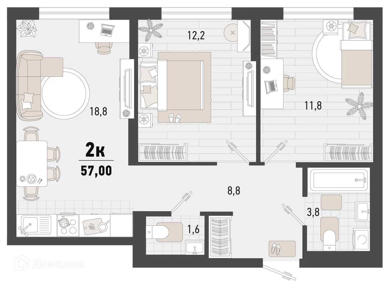 - Общая площадь: 57 м²