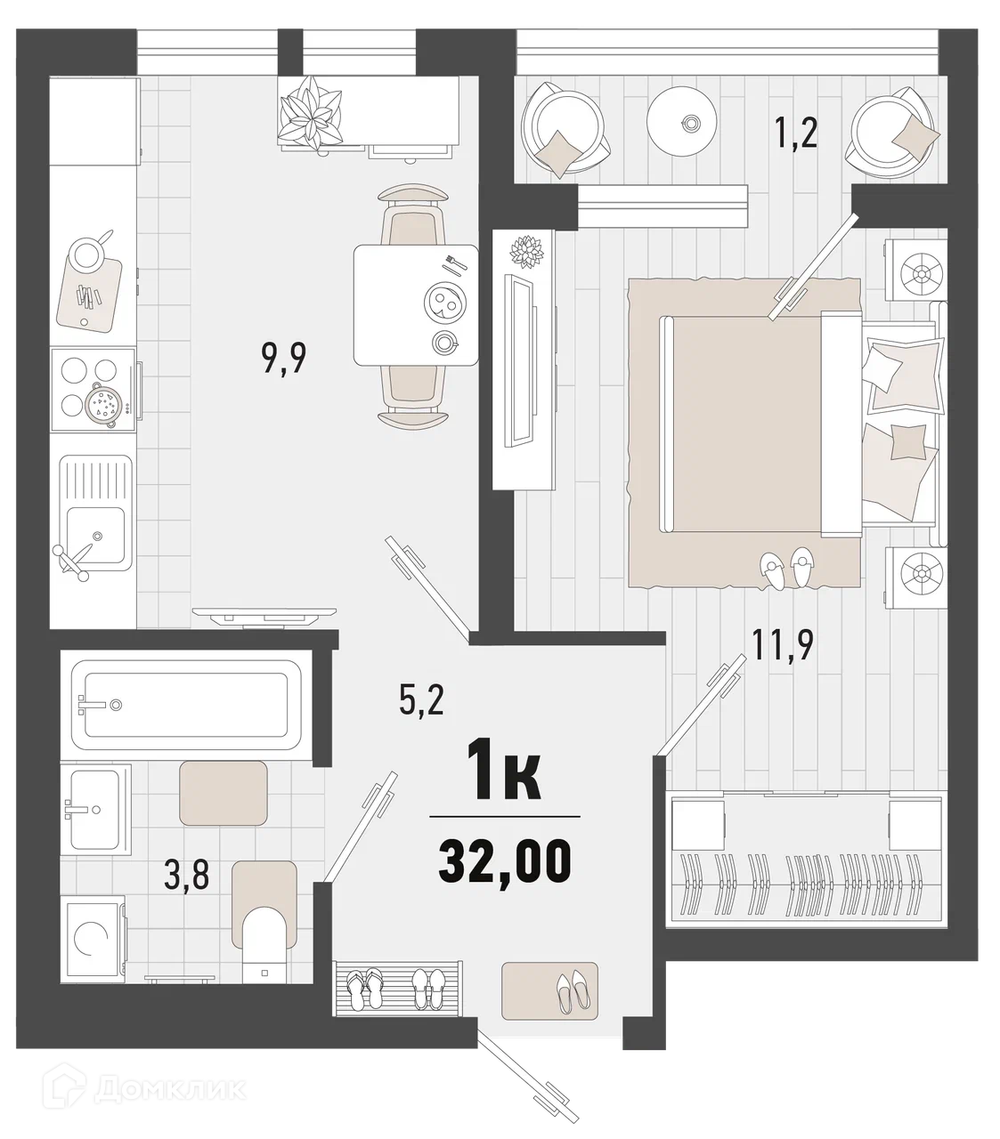 - ✅ Общая площадь: 32 м².