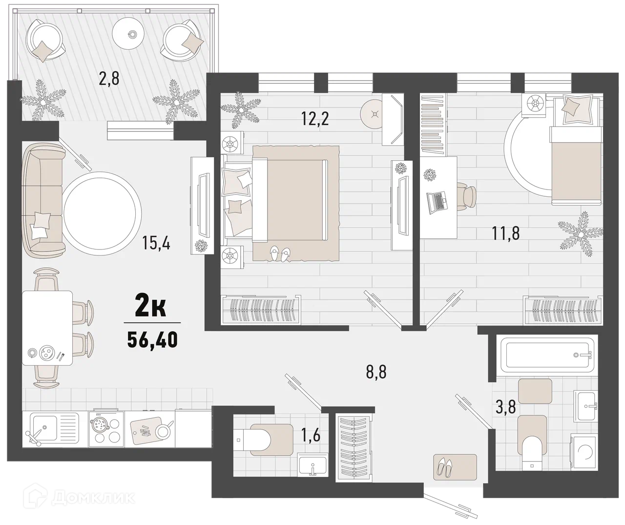 - ✅ Общая площадь: 56.4 м².