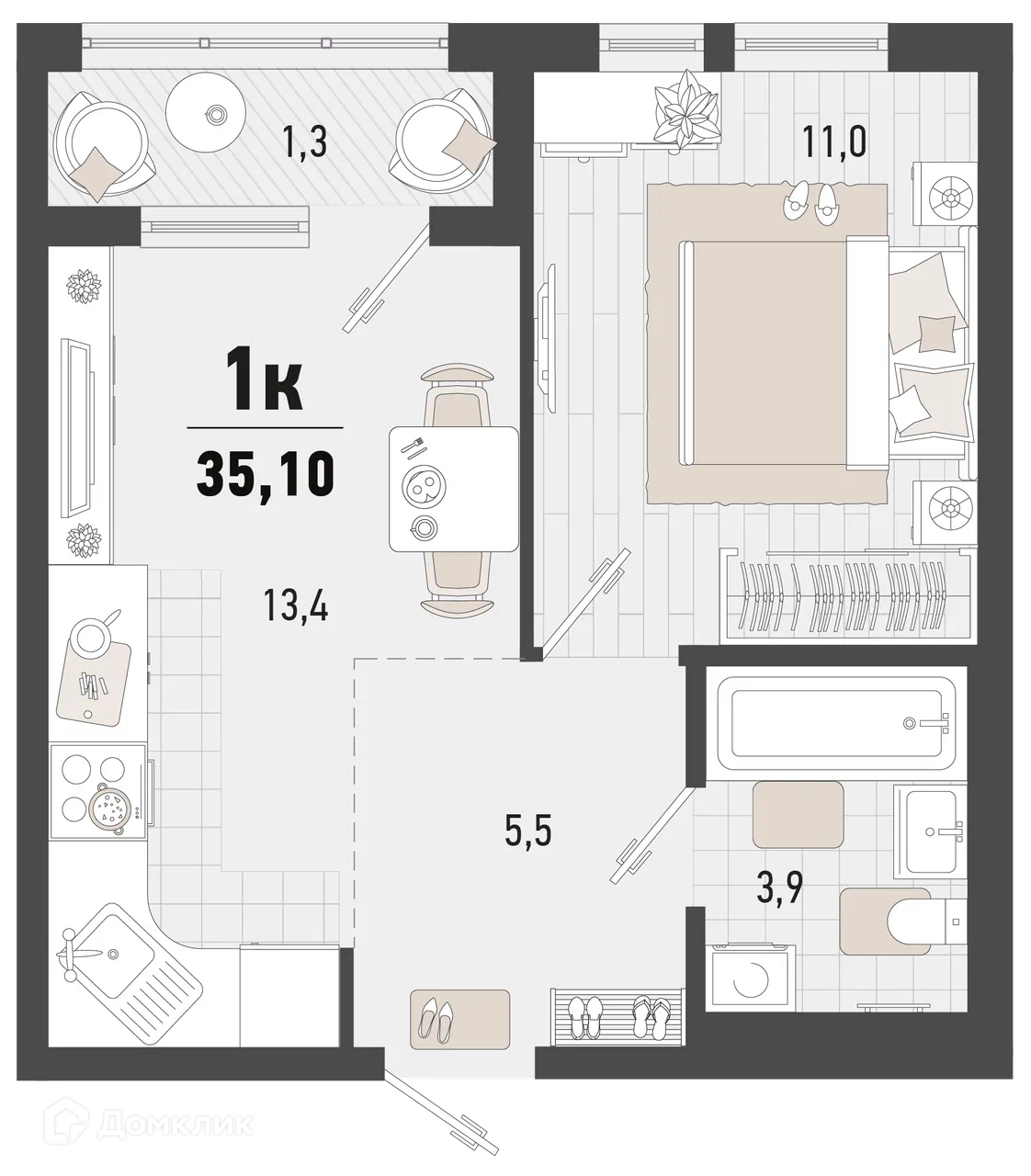 - Общая площадь: 35.1 м²