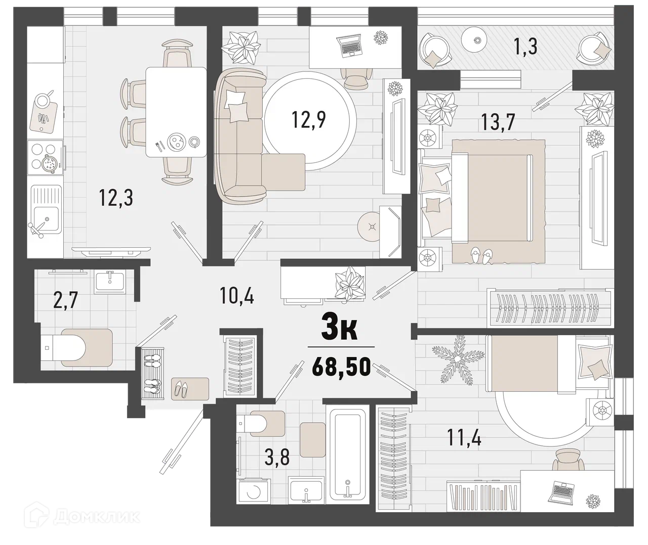 - Общая площадь: 68.4 м²