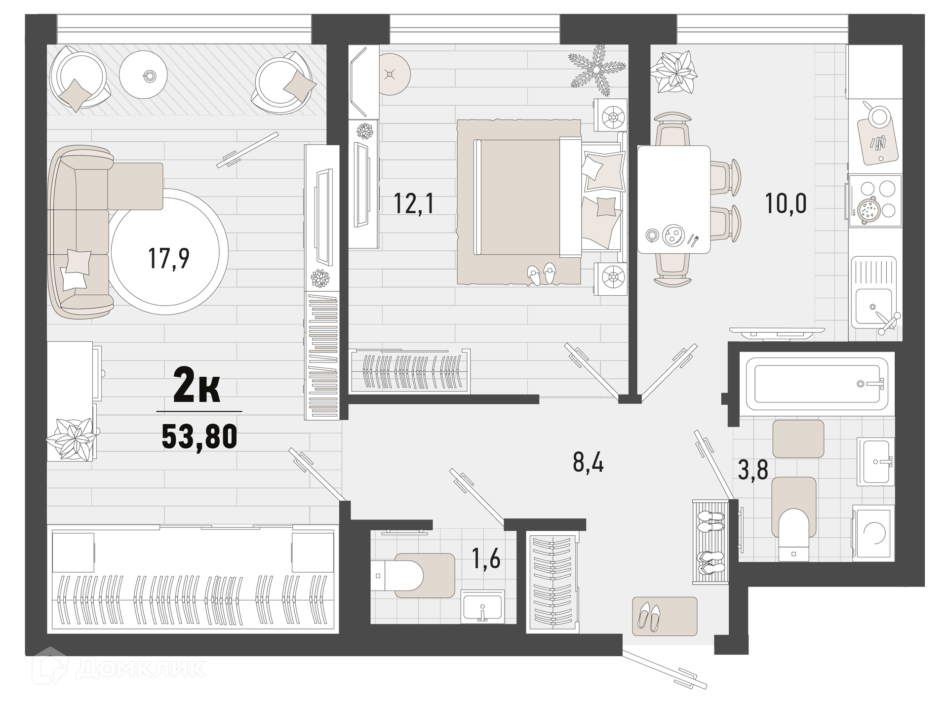- Общая площадь: 53.8 м²