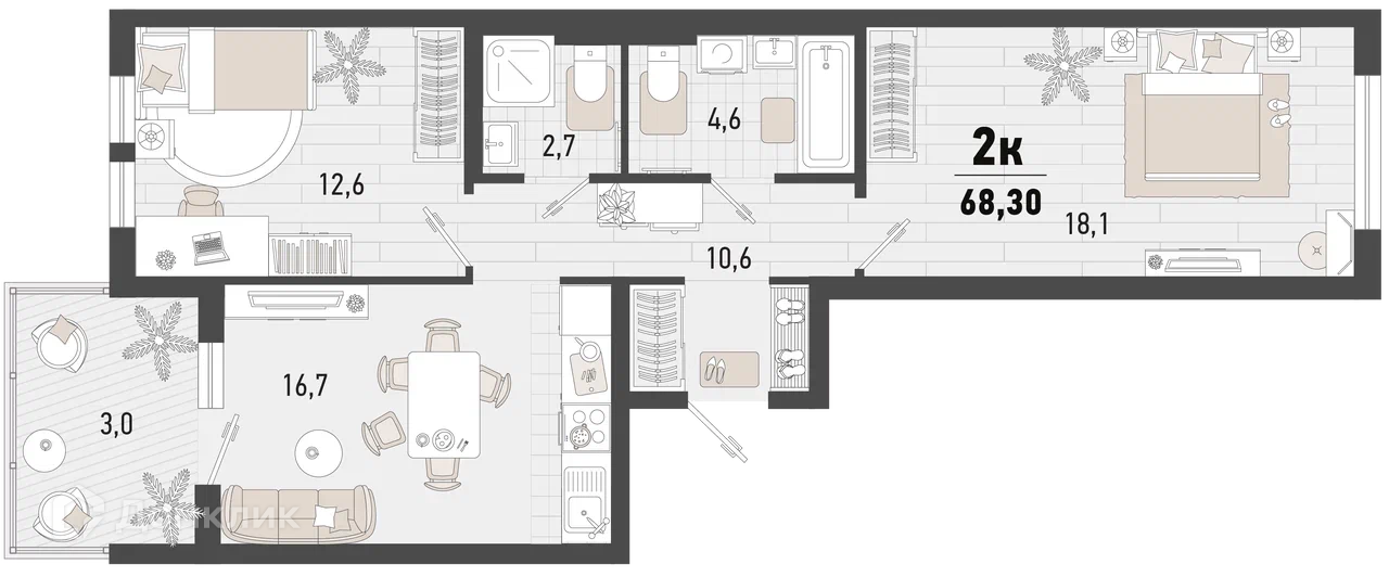 - Общая площадь: 68.3 м²