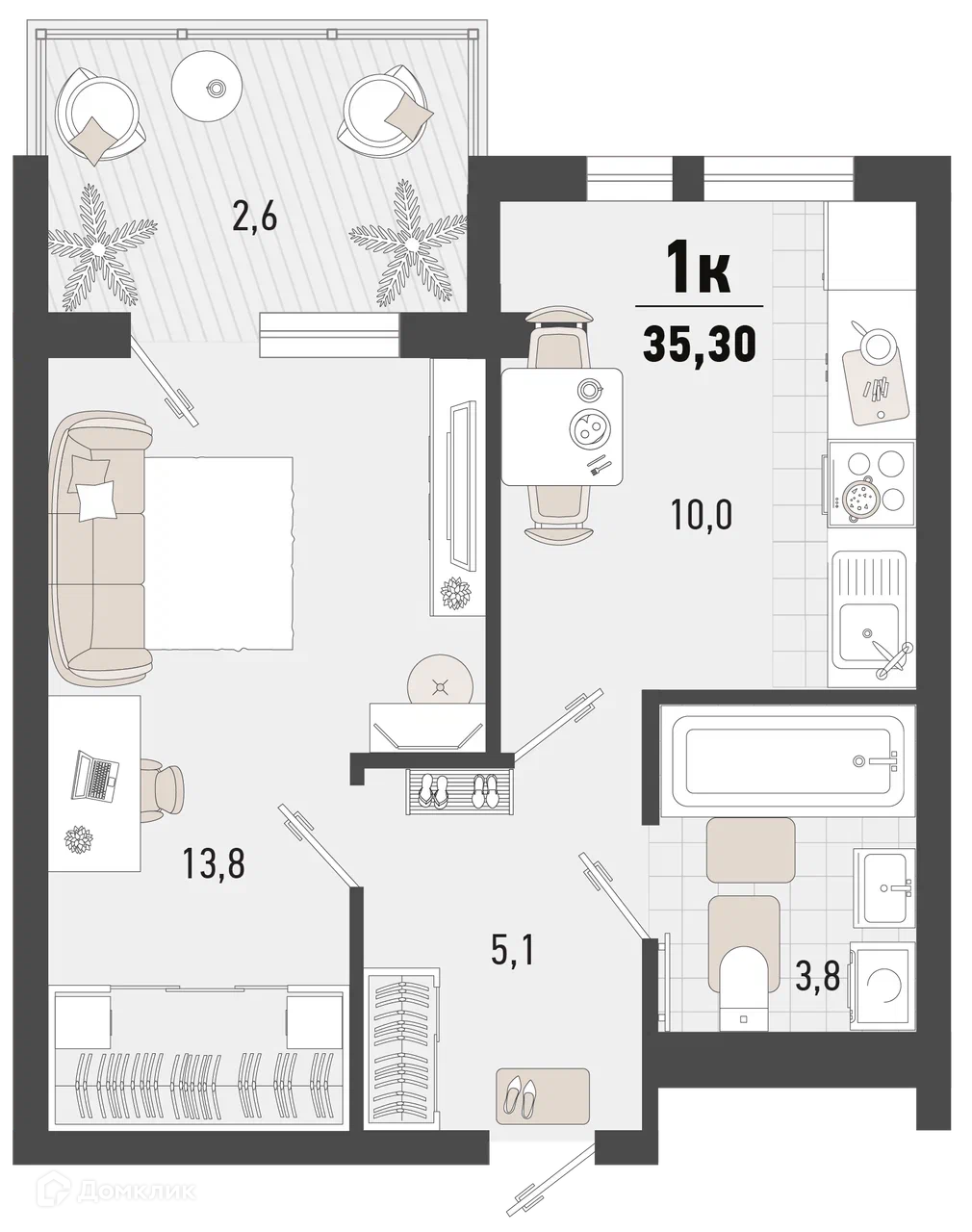 - Общая площадь: 35.3 м²