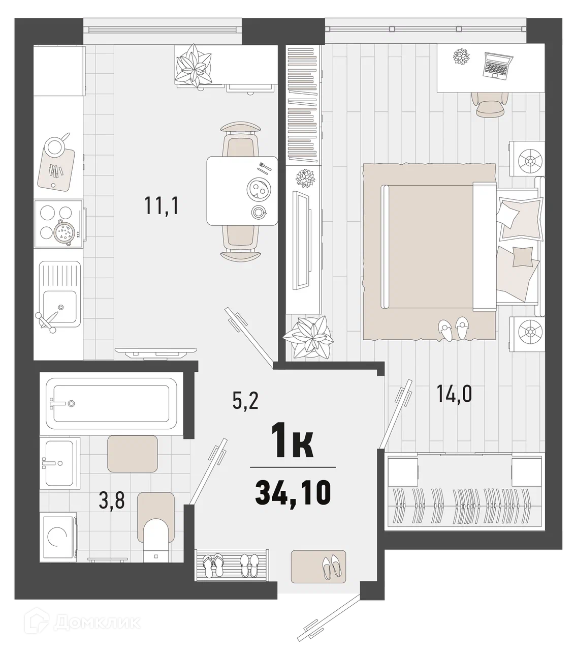 - ✅ Общая площадь: 34.1 м².