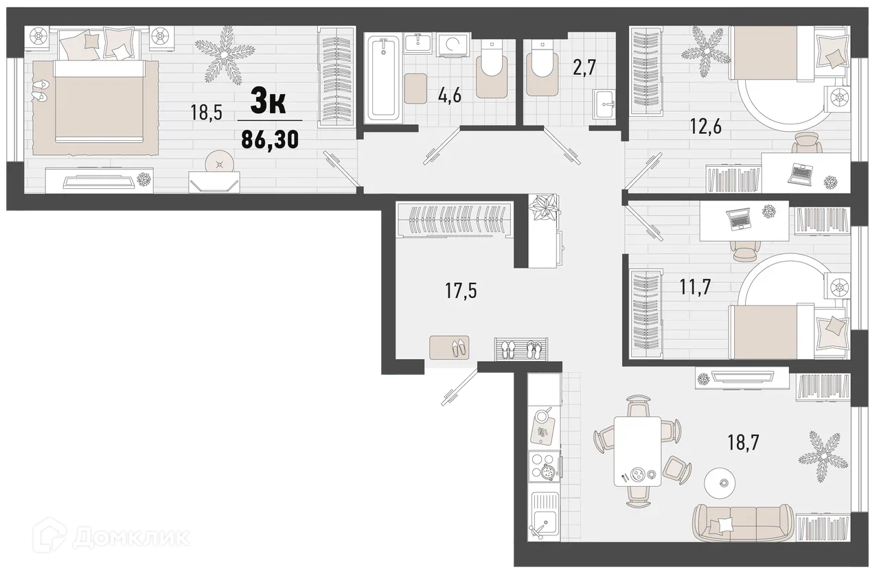 - ✅ Общая площадь: 86.3 м².