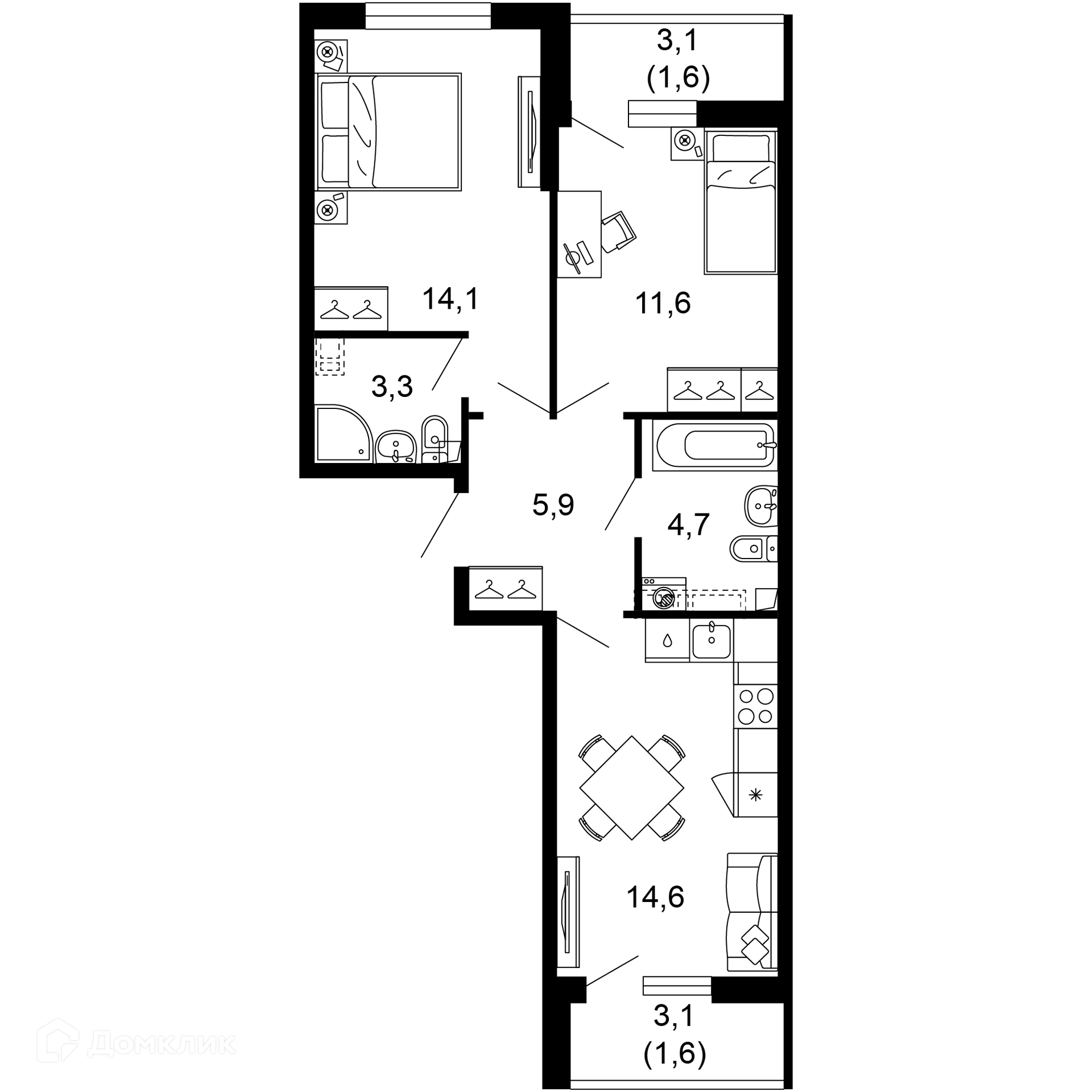 - ✅ Кухня: 14.6 м² — место для кулинарных шедевров.
