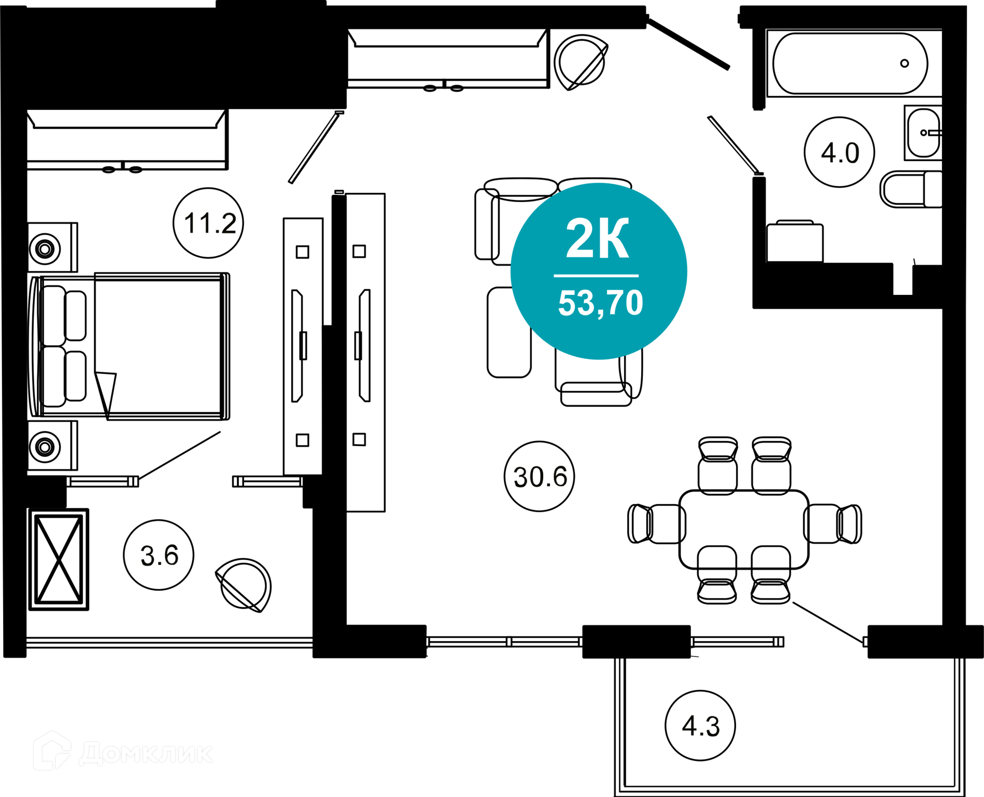 - Общая площадь: 53.8 м²