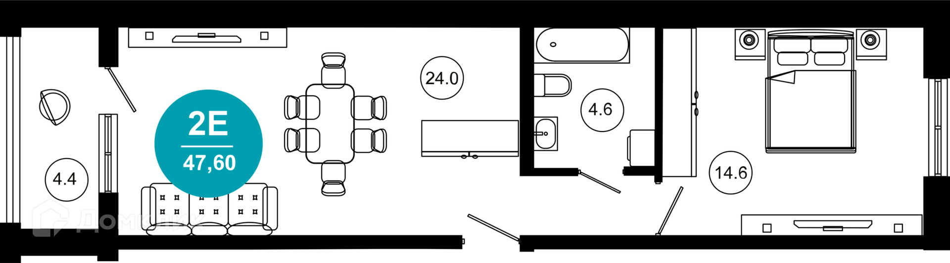- Общая площадь: 47.6 м²