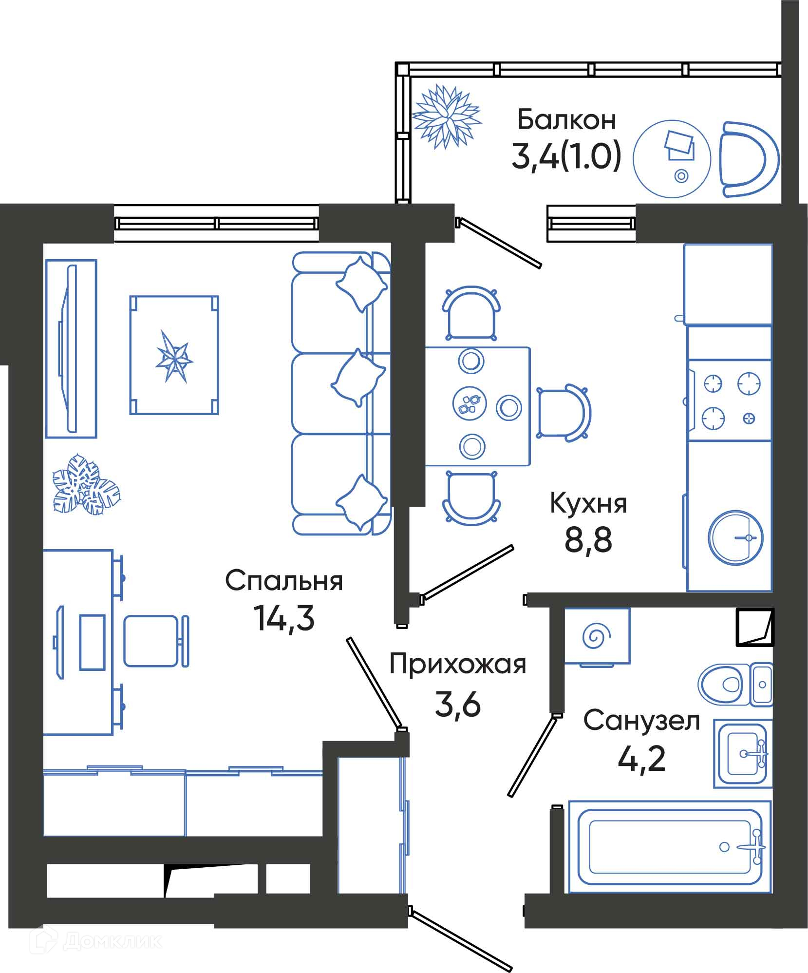 Планировка 1 комн. в ЖК ОБЛАКА