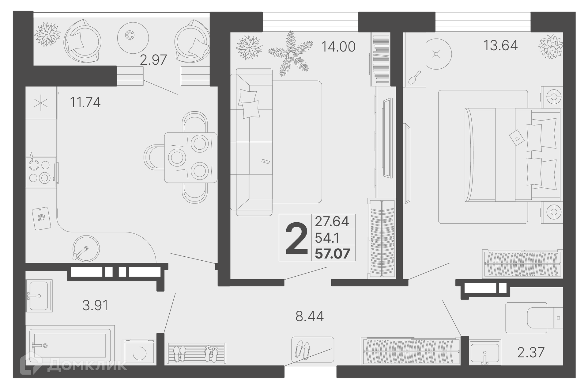 - Общая площадь: 55.59 м²