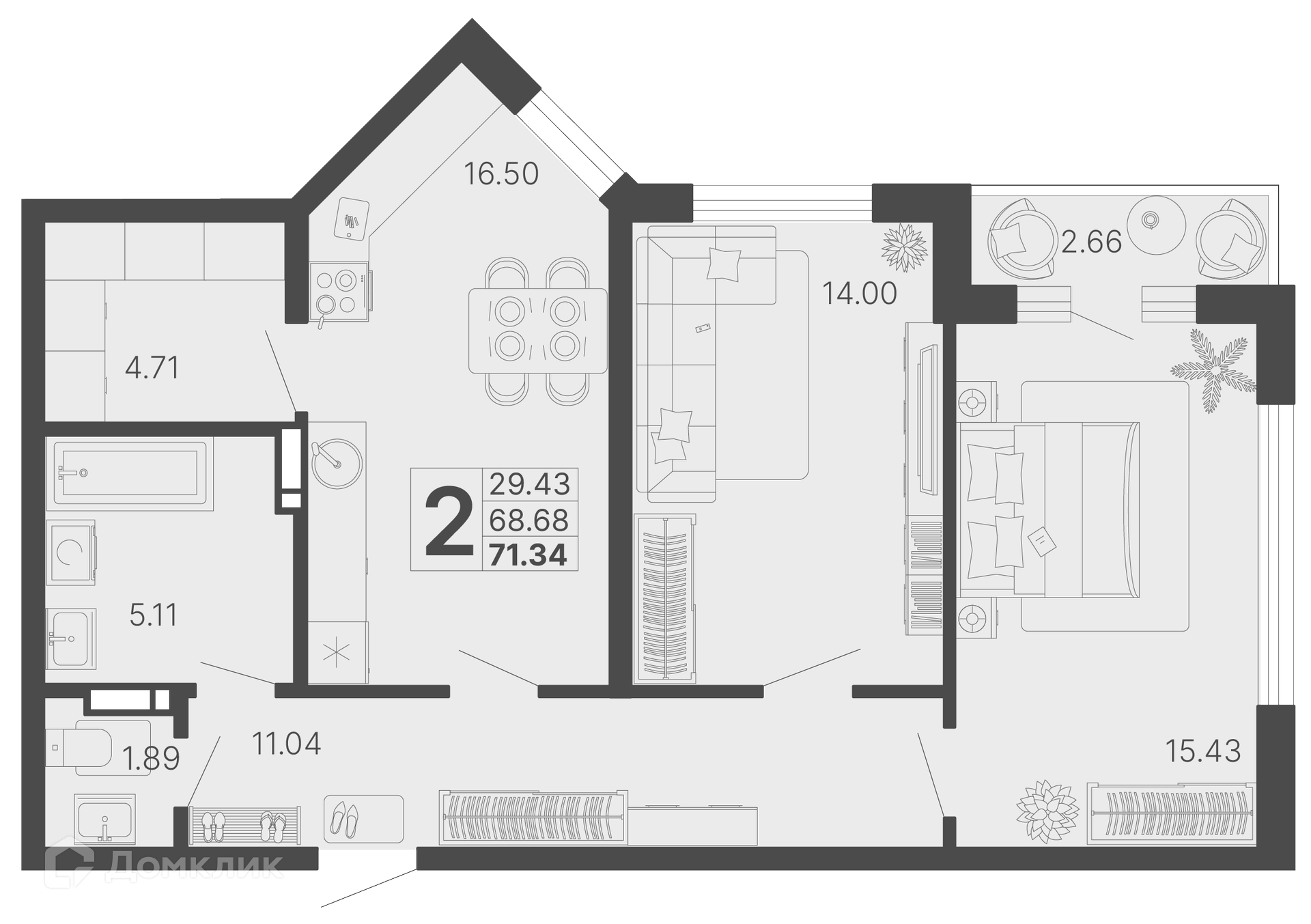 - Количество комнат: 2-комнатная квартира