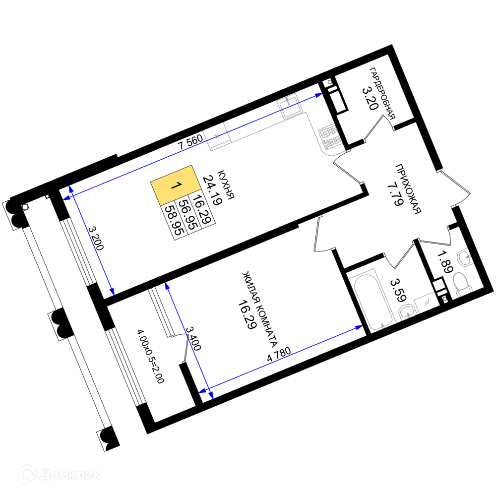 Планировка 1 комн. в ЖК Резиденция морей
