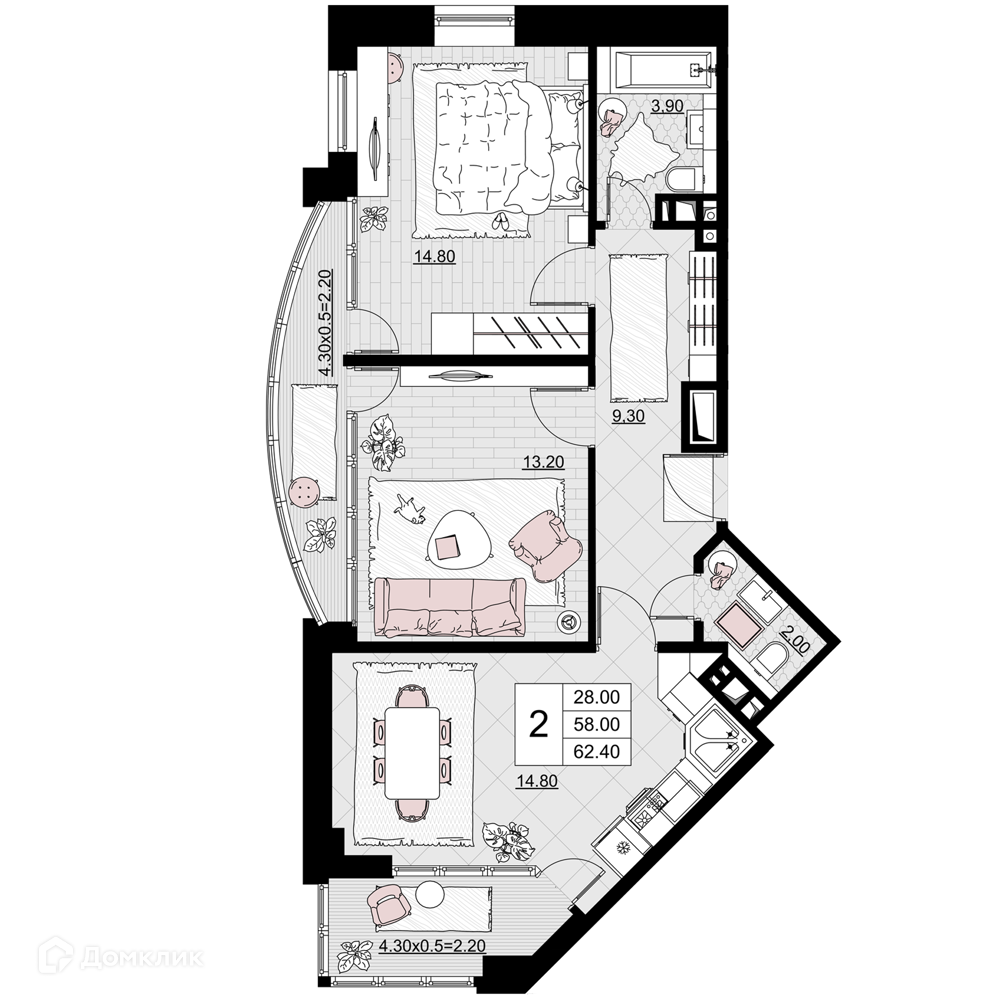 - Количество комнат: 2-комнатная квартира
