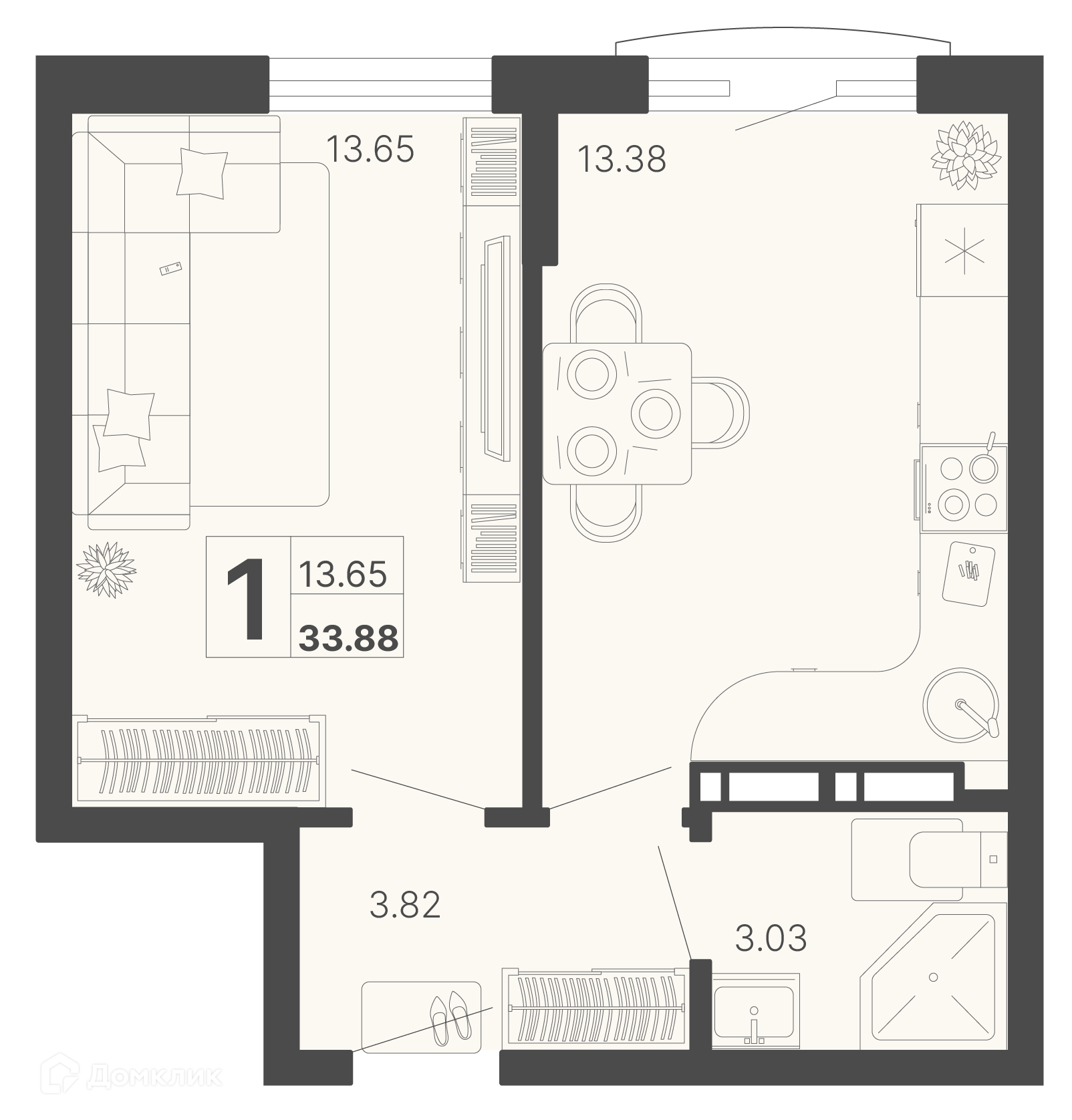 - ✅ Общая площадь: 33.88 м².