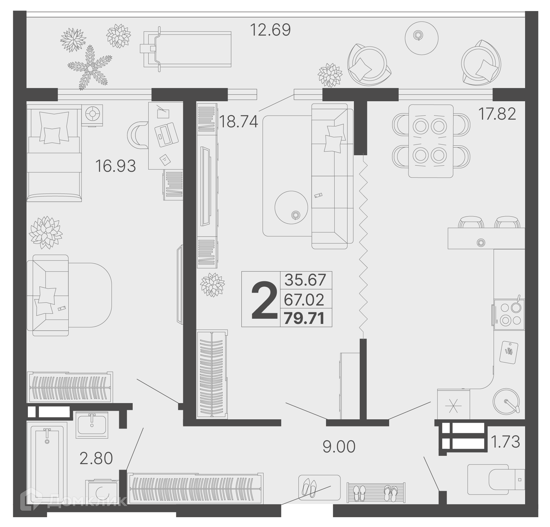 - Общая площадь: 73.37 м²