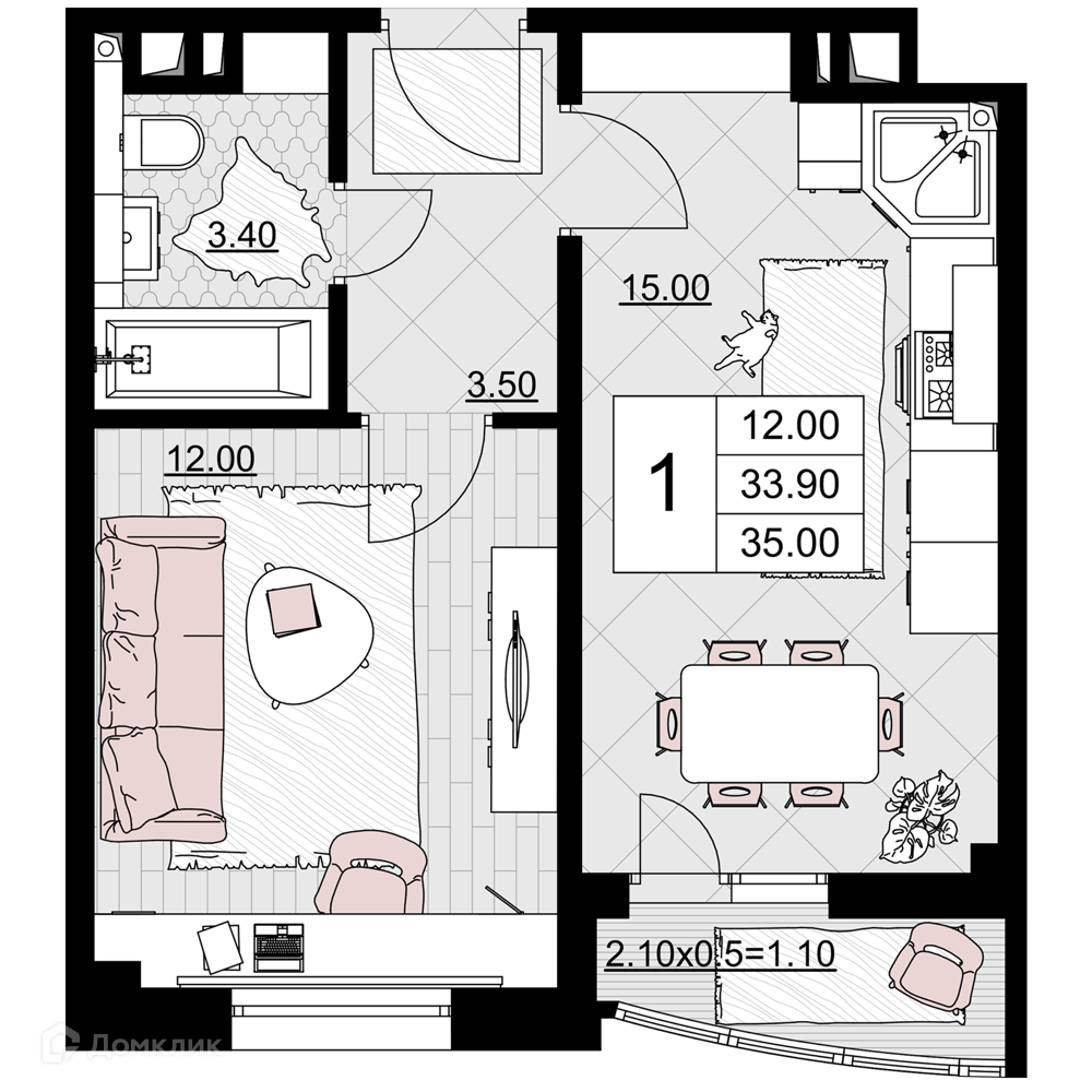 - Общая площадь: 35 м²