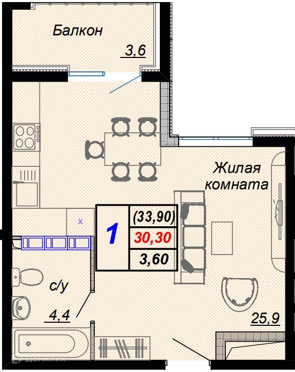 Планировка 1 комн. в ЖК "Чайные холмы"