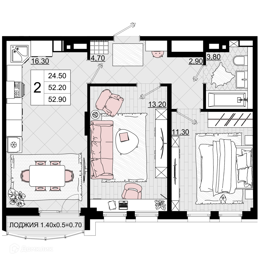 Планировка 2 комн. в ЖК Песчаный