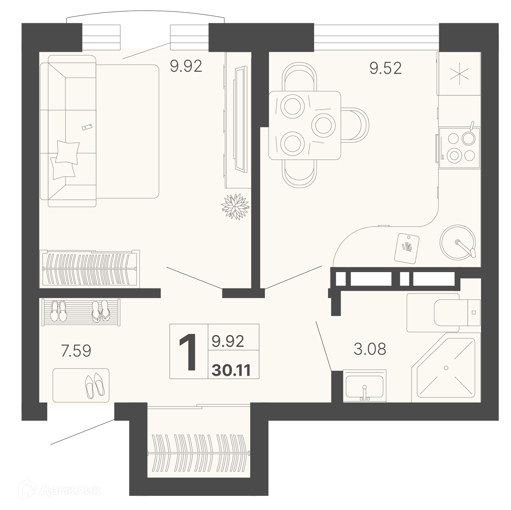 - Общая площадь: 30.11 м²