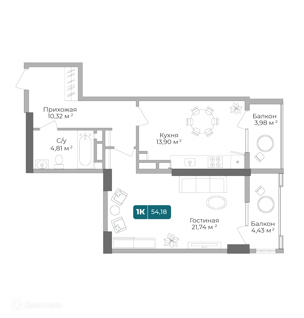 - ✅ Общая площадь: 54.18 м².