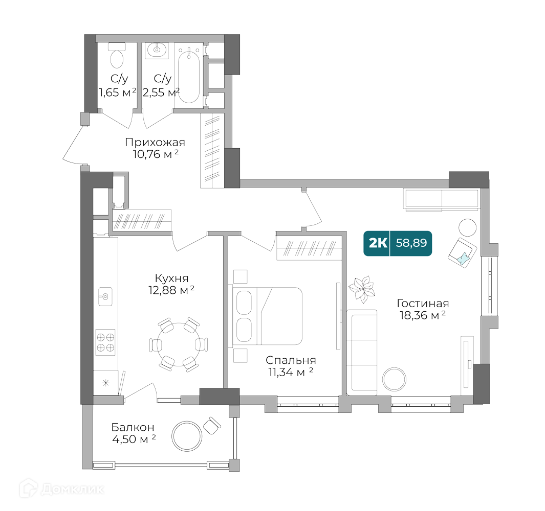 - Общая площадь: 58.74 м²