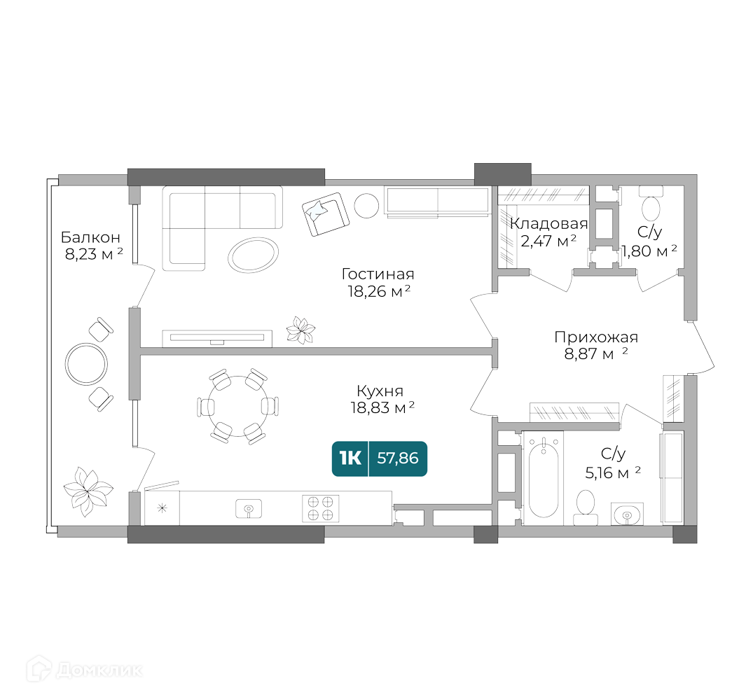 - ✅ Кухня: 18.83 м² — эргономичное пространство.