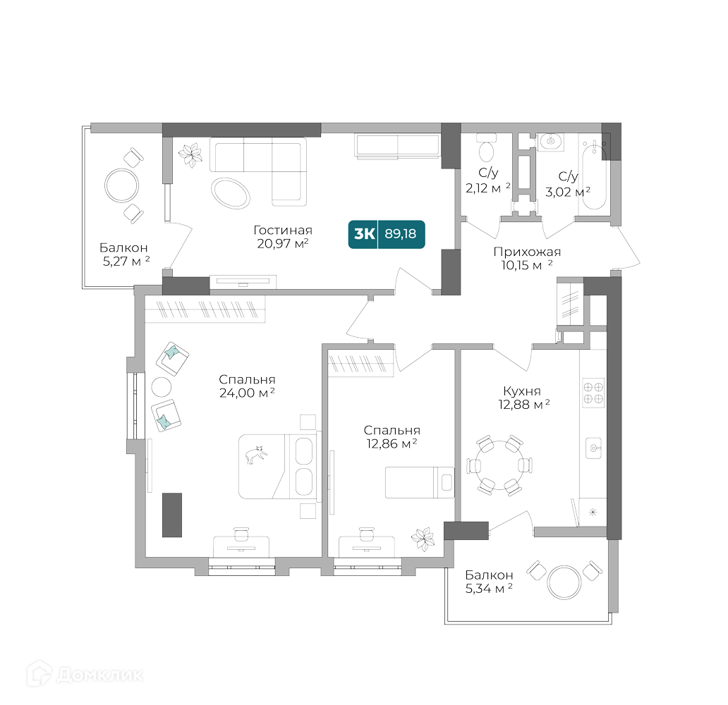 - ✅ Кухня: 12.88 м² — эргономичное пространство.