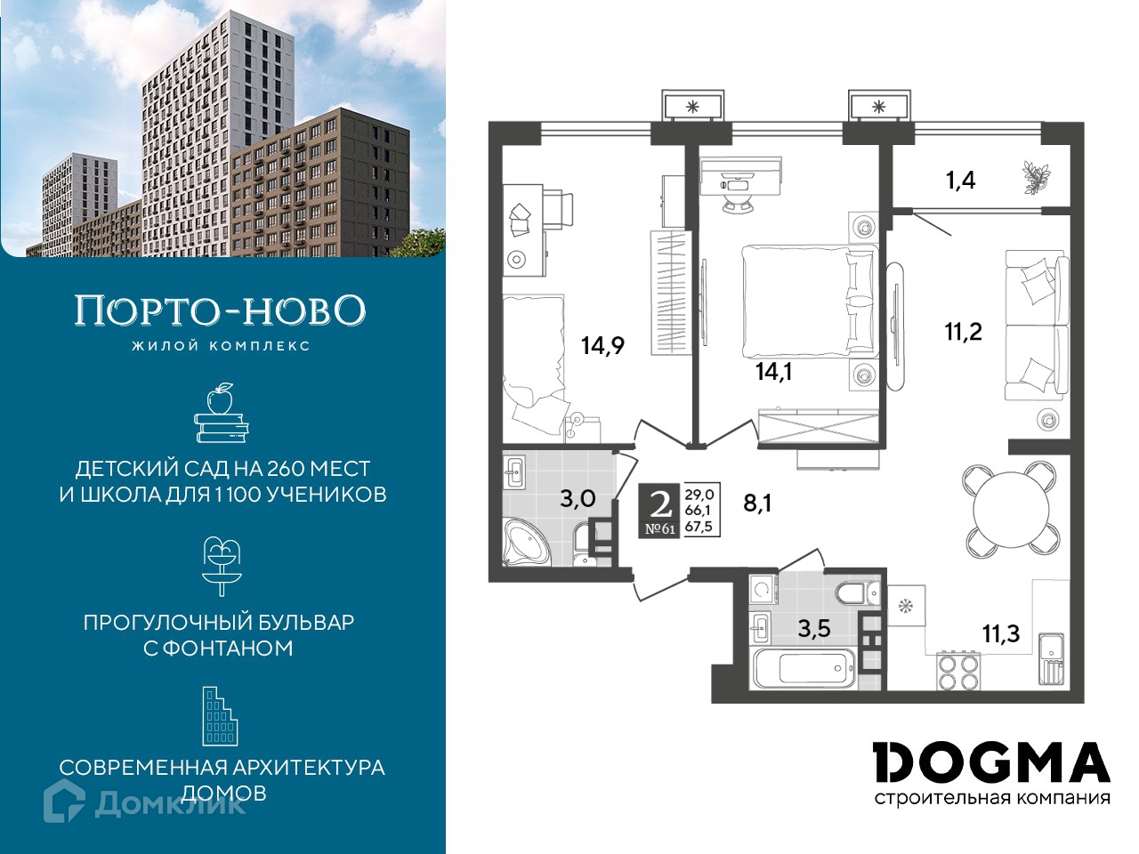 ЖК «Порто-Ново» — новый порт для комфортной жизни. 10 домов переменной этажности с террасами на десятом этаже. Дворовые пространства в виде «портов» со своей инфраструктурой: детские и спортивные зоны легко уживаются с зонами отдыха взрослых, а прогулочный бульвар с фонтаном придаёт кварталу ощущение полноты и гармонии жизни. Школа на 1 100 мест, детский сад на 260 мест и ФОК дополняют инфраструктуру всего микрорайона и создают причал для новых возможностей. - Детские площадки из натуральных безопасных материалов - Места для спокойного отдыха во дворе со скамейками и крытыми зонами - Детский сад на 260 мест и школа для 1 100 учеников в нескольких минутах от дома - Физкультурно-оздоровительный комплекс и спортхаб в дворе - Квартиры с отделкой от застройщика - Видовые квартиры с террасами на вторых и десятых этажах домов - Резервные накопители воды и собственная котельная - Прогулочный бульвар с фонтаном - Собственная остановка городского транспорта - Отдельная площадка для выгула собак - Сквозные подъезды с выходами в приватный двор и на улицу - Входы на уровне земли, без порогов и перепадов по высоте - Современная архитектура домов - Специальные места для хранения колясок, велосипедов и самокатов - Два подземных паркинга с зарядками для электроавтомобилей - Соседский центр DOGMA Клуб для сообщества соседей - Специальная зона для гриля и барбекю - Торговая аллея с магазинами