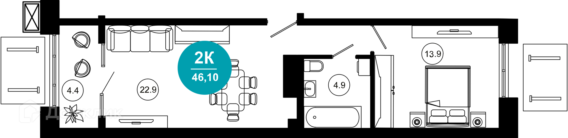 - Общая площадь: 46.1 м²