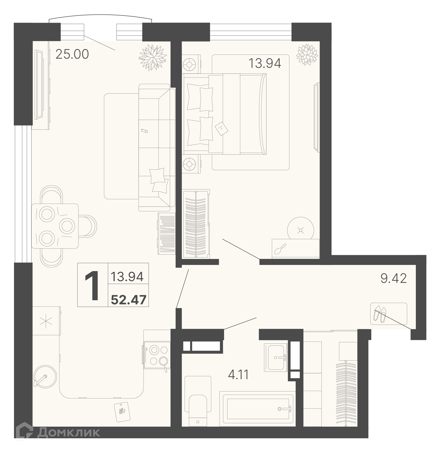 - Общая площадь: 52.47 м²