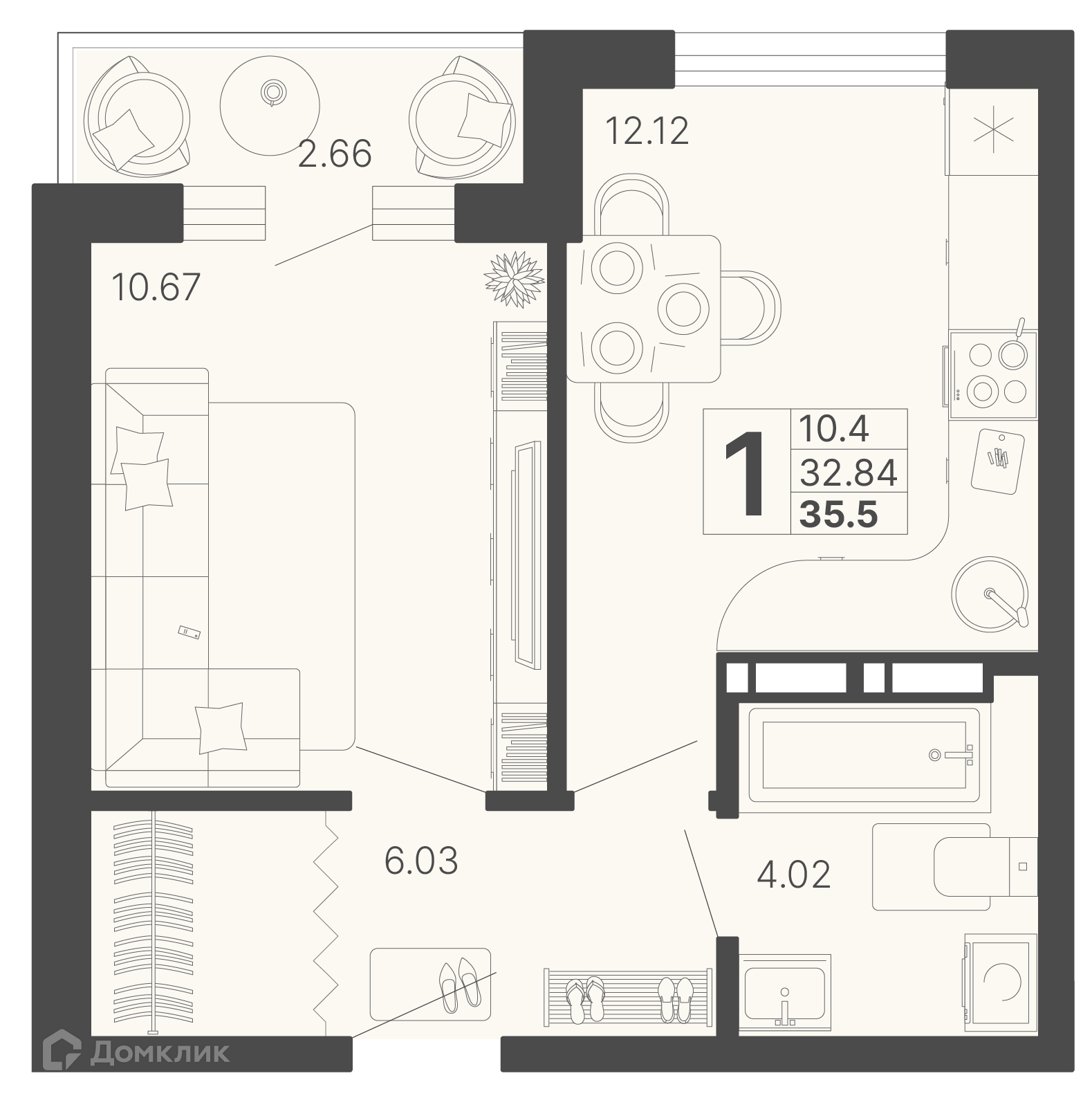 - Общая площадь: 34.17 м²