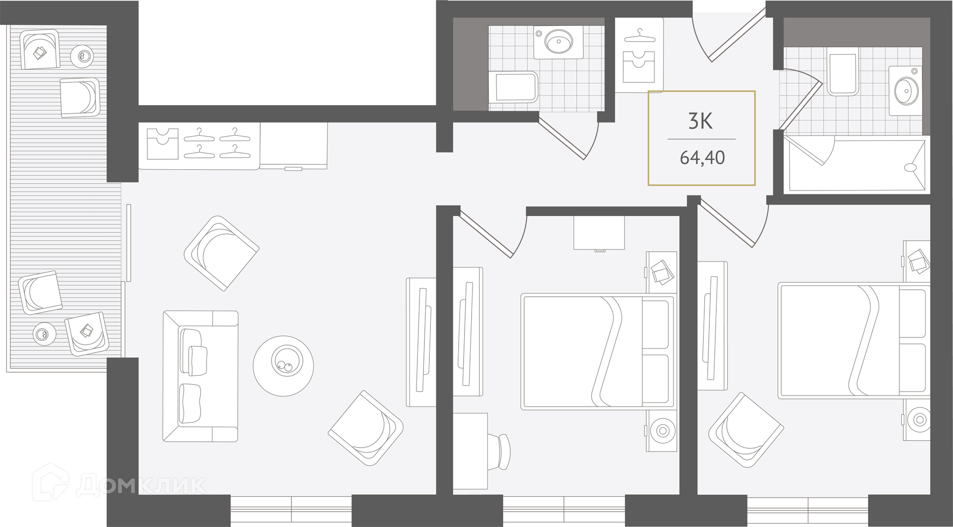 - Общая площадь: 64.4 м²