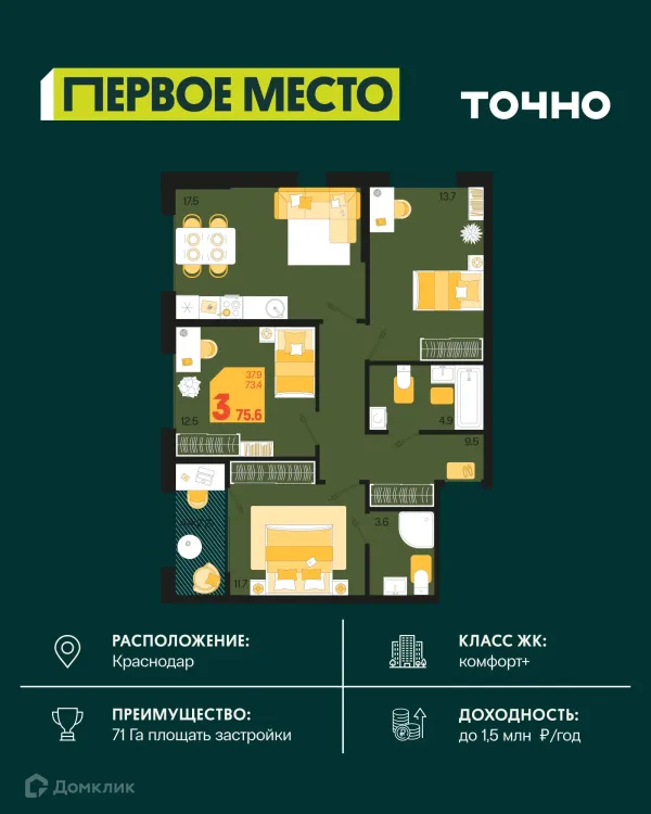 3 комн. квартира в Краснодаре в ипотеку от 73 595 руб/месяц