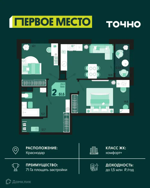 2 комн. квартира в Краснодаре в ипотеку от 73 959 руб/месяц