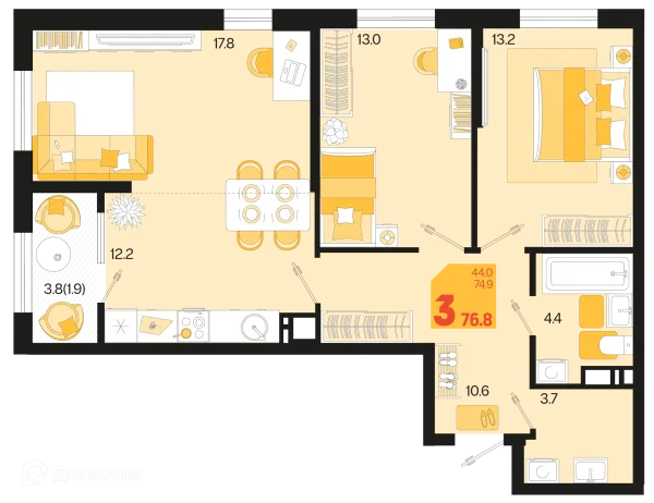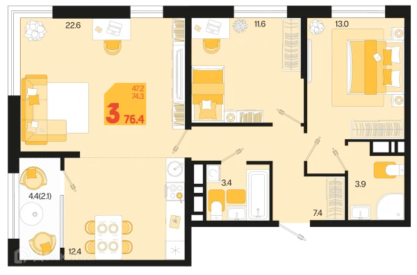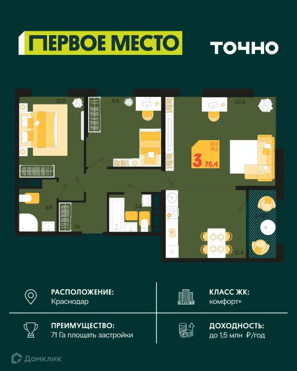 3 комн. квартира в Краснодаре в ипотеку от 75 756 руб/месяц