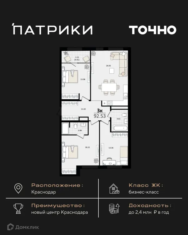 3 комн. квартира в Краснодаре в ипотеку от 177 638 руб/месяц