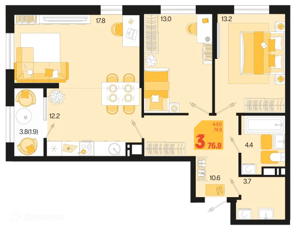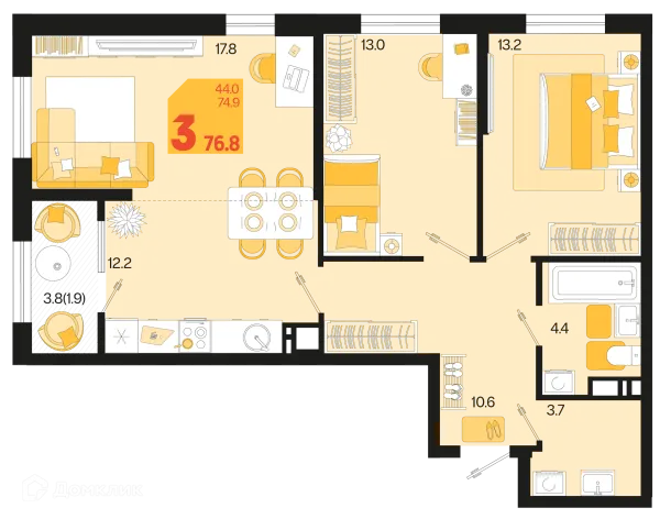 3 комн. квартира в Краснодаре в ипотеку от 75 756 руб/месяц