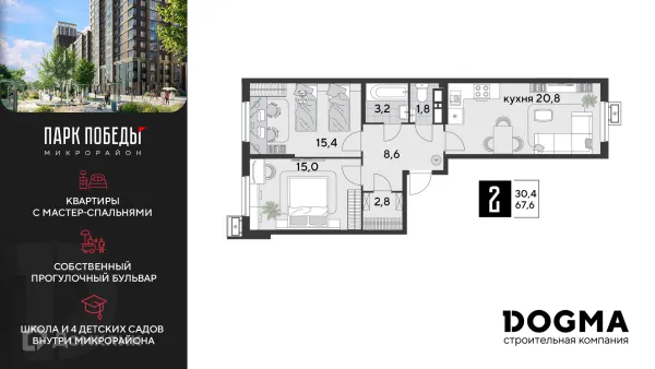 2 комн. квартира в Краснодаре в ипотеку от 68 199 руб/месяц