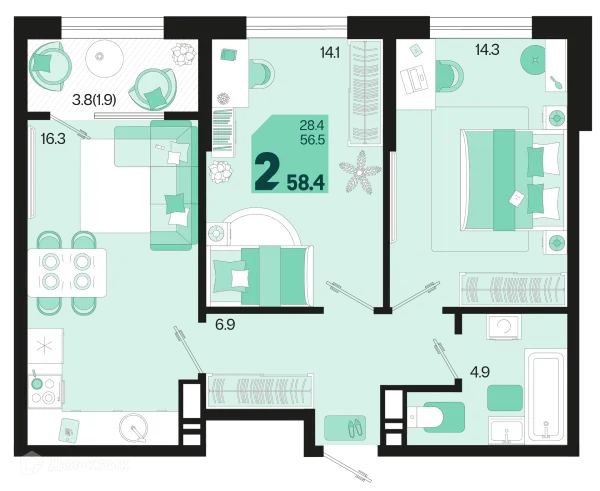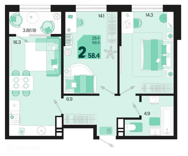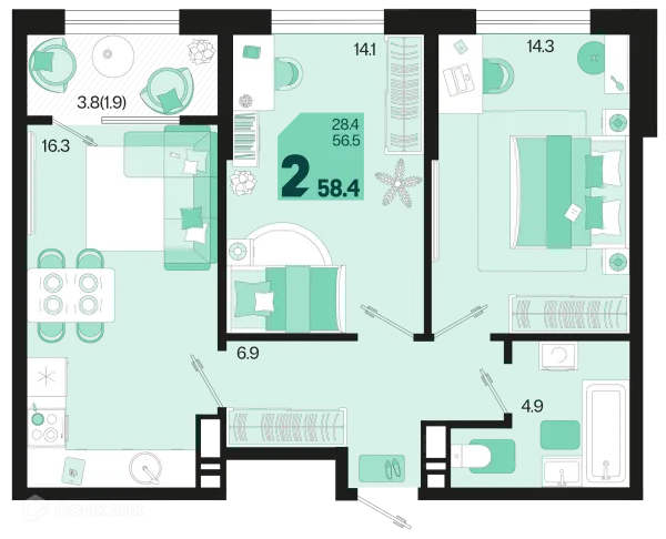 2 комн. квартира в Краснодаре в ипотеку от 57 543 руб/месяц