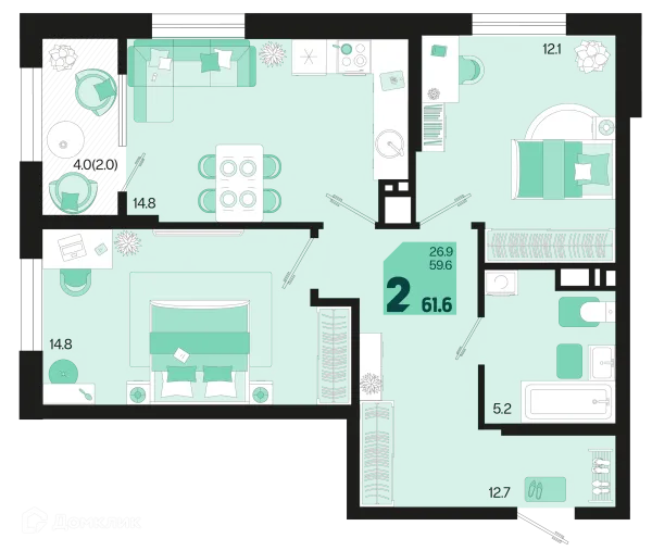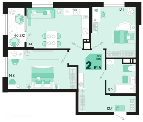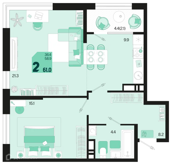 2 комн. квартира в Краснодаре в ипотеку от 61 123 руб/месяц