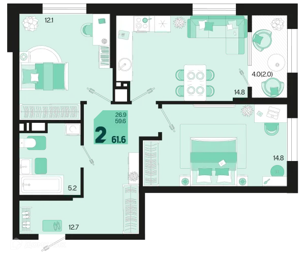 2 комн. квартира в Краснодаре в ипотеку от 73 817 руб/месяц