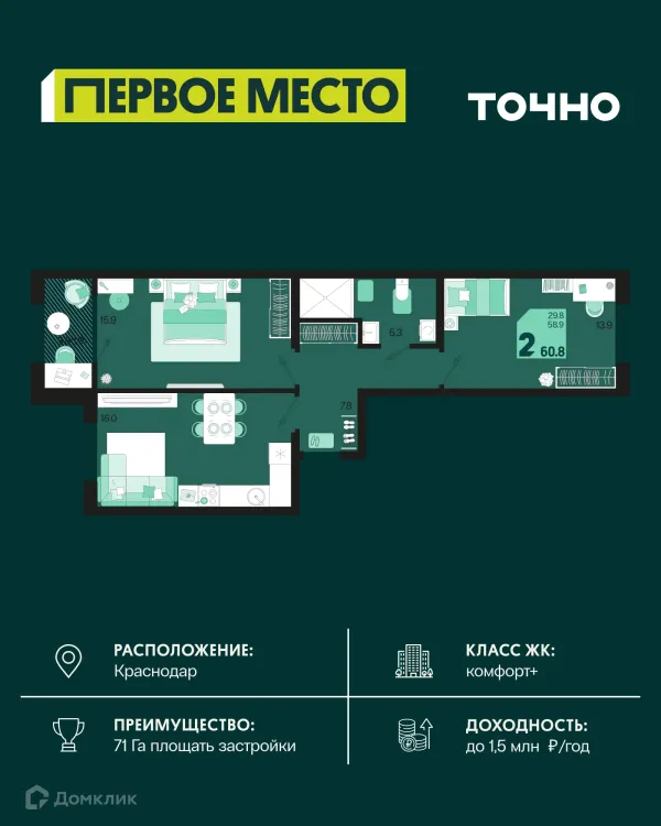 2 комн. квартира в Краснодаре в ипотеку от 69 928 руб/месяц