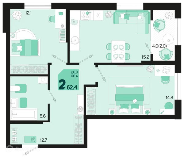 2 комн. квартира в Краснодаре в ипотеку от 62 760 руб/месяц